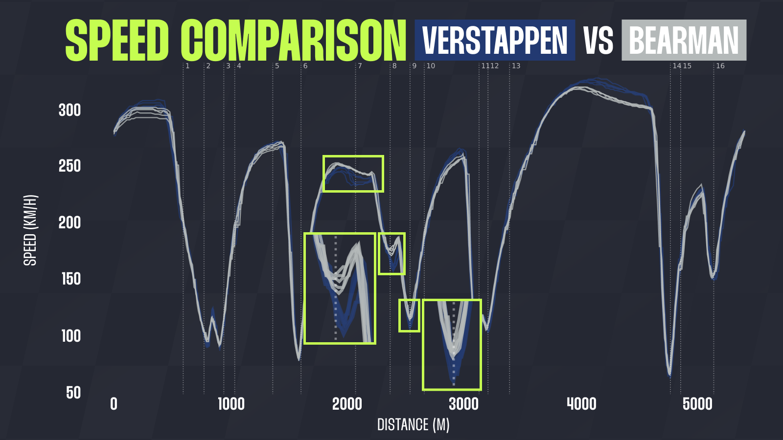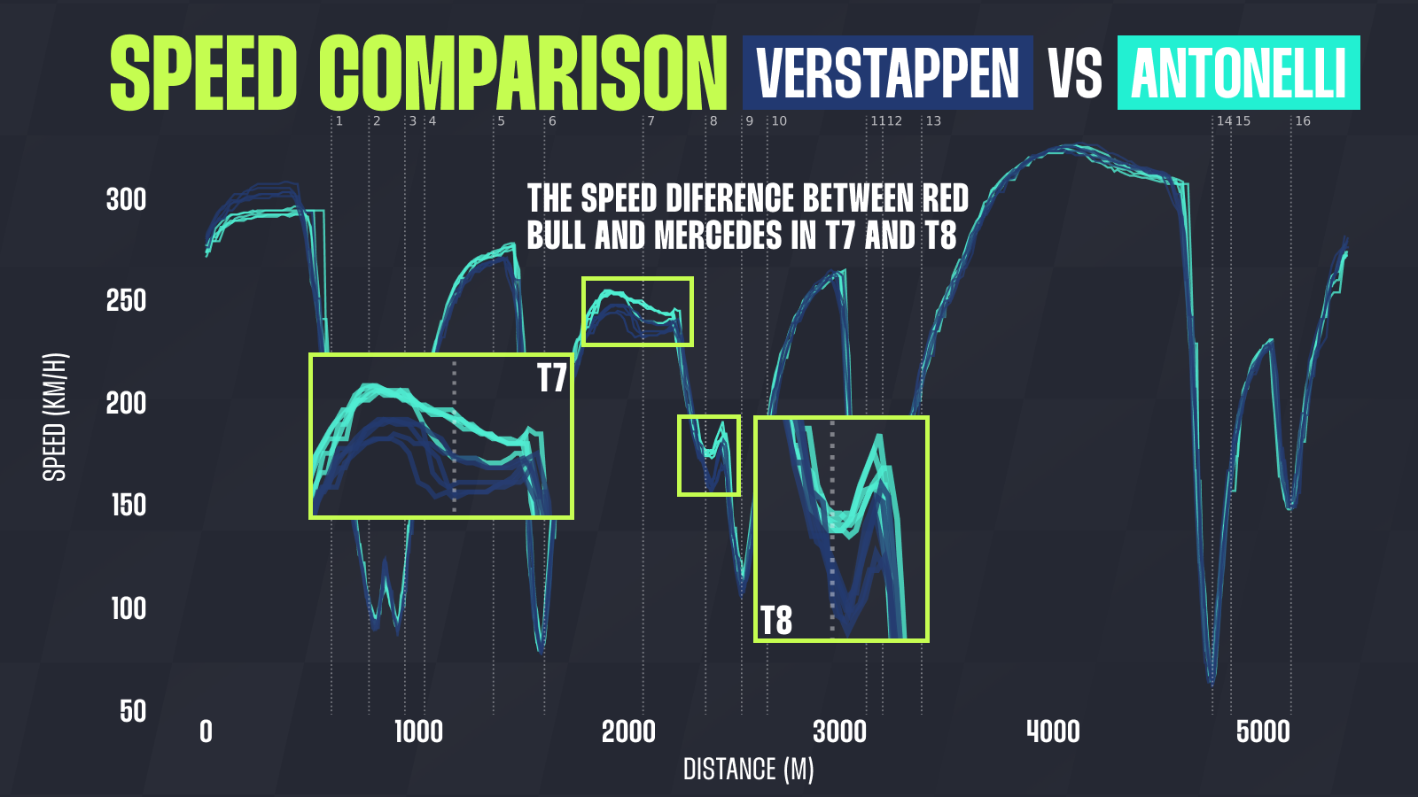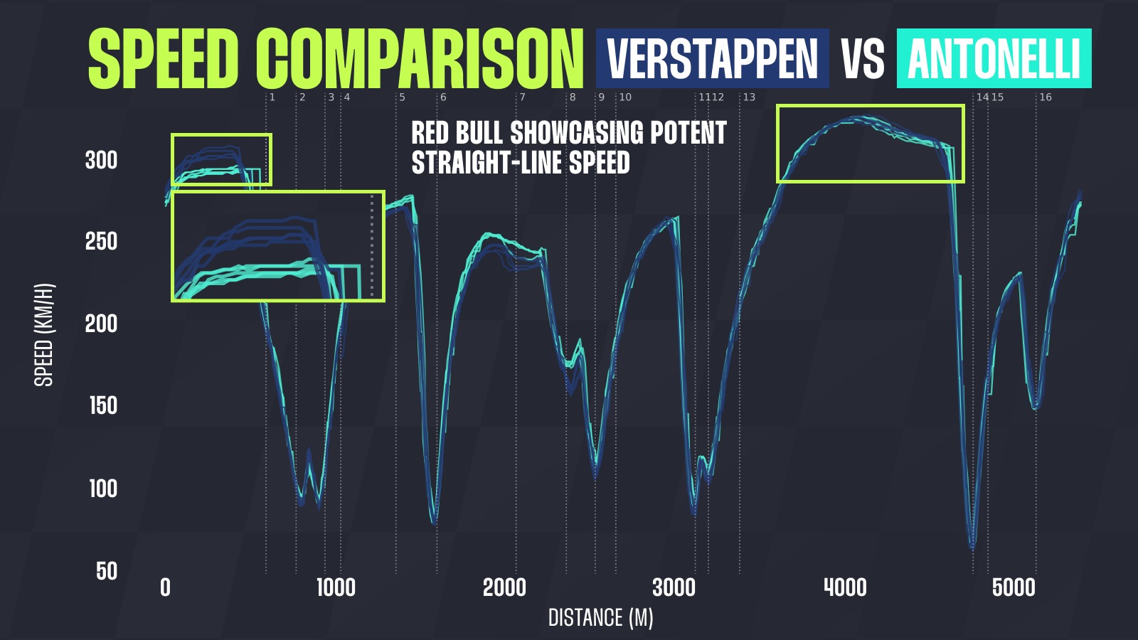 The top-speed figures are much better, with Max matching Antonelli on the T13–T14 straight and even beating him on the start-finish straight, as can be seen on the graph below.