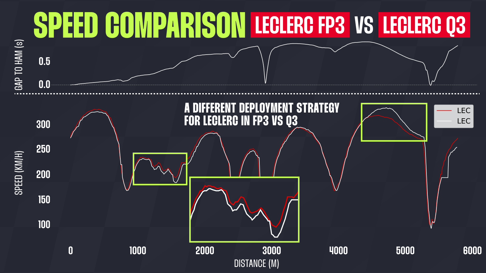 In FP3 (shown in white), Leclerc was significantly slower through the S-curves – notice the rise of the delta line in this part of the track. However, this gives him the chance to collect more electrical energy which he uses later on the straight – once again, we can see the difference in the delta time, which now drops.