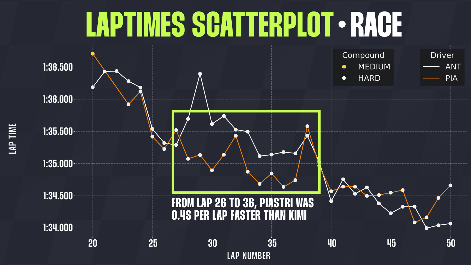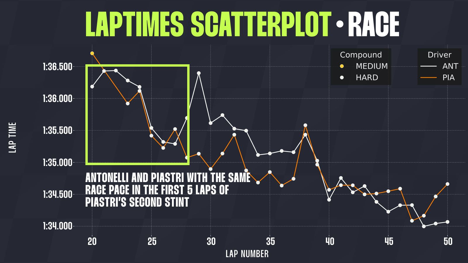 It took Piastri five laps on his new tyres before he began reducing the gap. Over the next ten laps, during his chase, he was around 0.4 seconds per lap faster than Antonelli, with Leclerc a tenth faster compared to him.