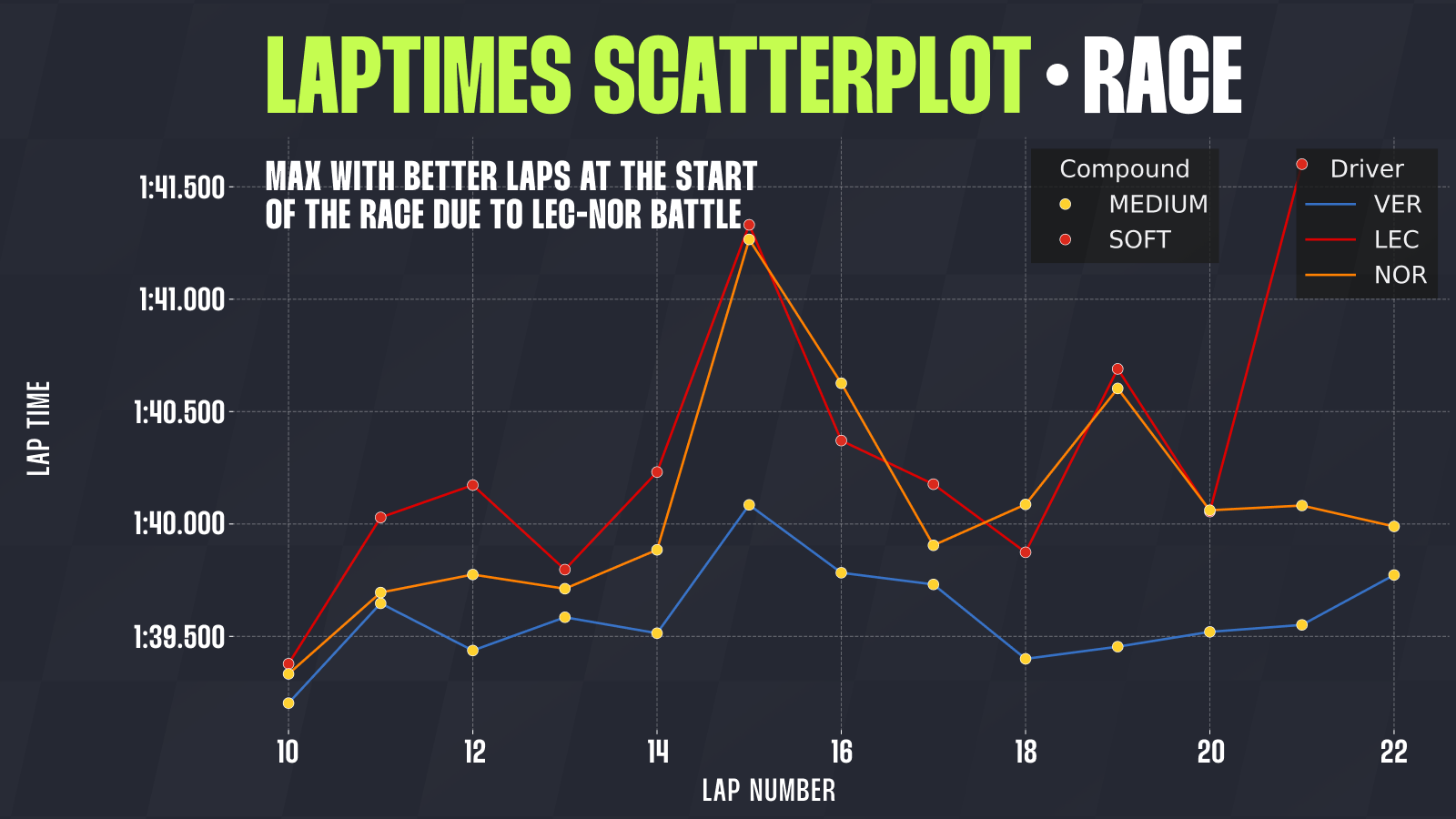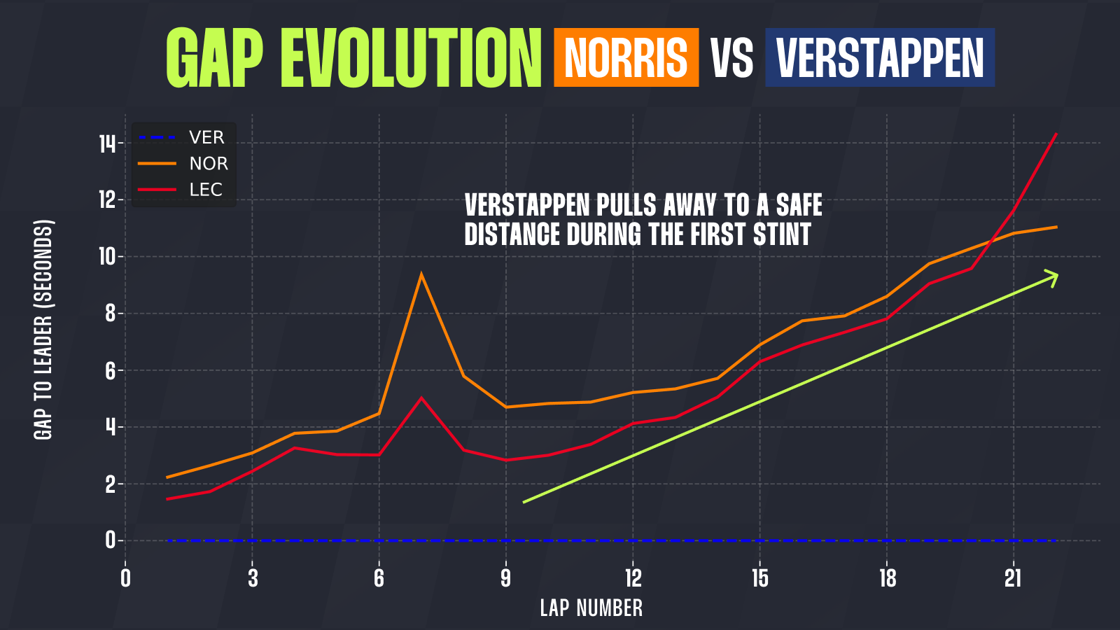 Almost certainly yes. If we look at the lap time differences, Verstappen created his entire winning gap in the first stint — during that initial fight between Norris and Leclerc. From that point on, he simply managed the gap, which isn’t hard to do when you’re leading in clean air.