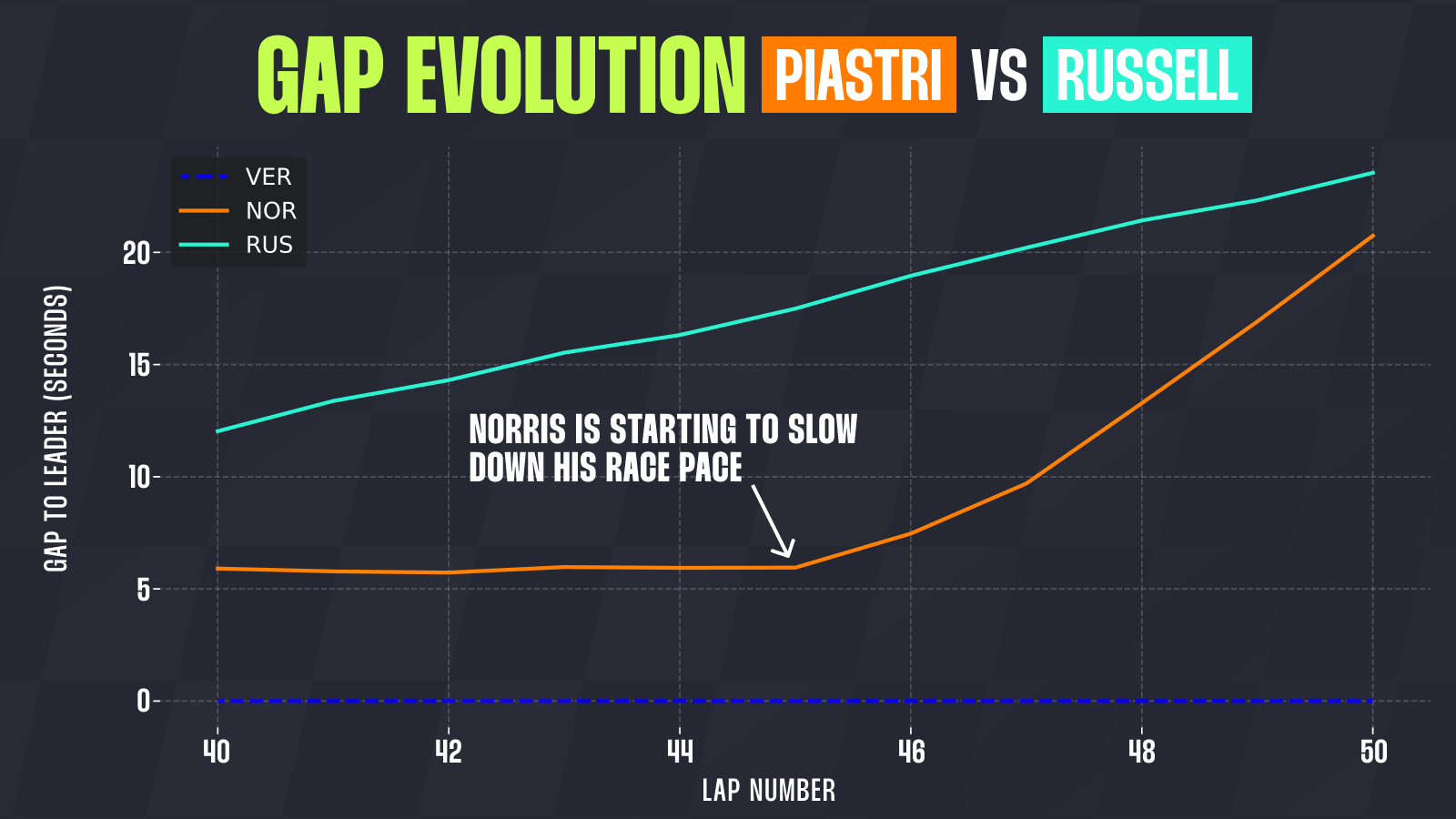 Norris’ race pace suddenly started to fall. Two laps later, he was almost four seconds per lap slower than Verstappen – a massive drop-off. Russell was just 11 seconds behind at the moment when Norris’ pace collapsed.