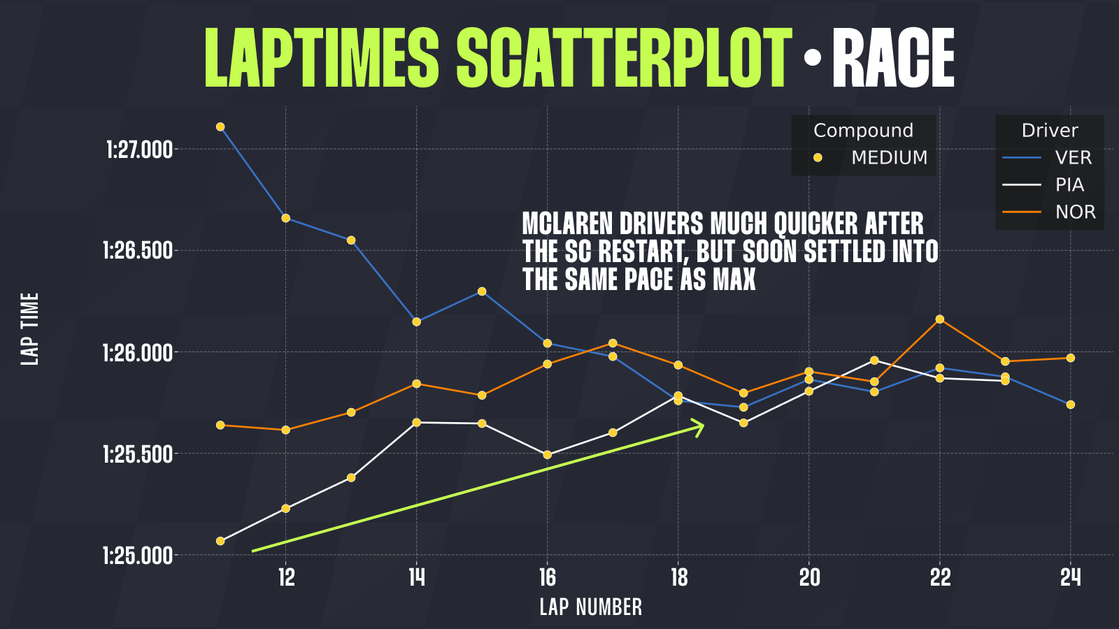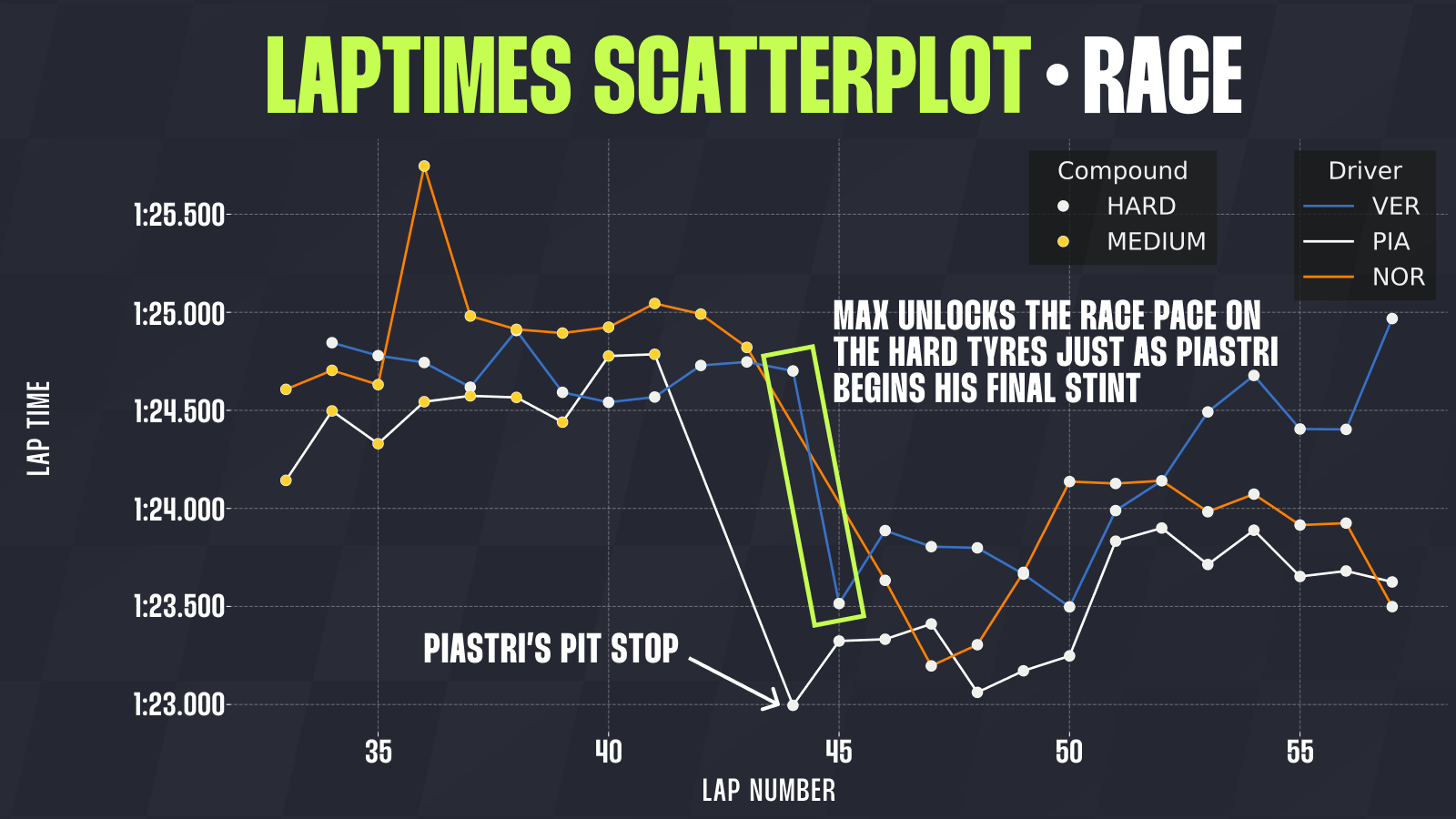 In reality, the attempt did make sense given Verstappen’s better-than-expected pace on hard tyres. Had Piastri continued at the same level and stopped six laps earlier (the maximum possible because of the 25 laps rule). He would need to be 2.2 seconds per lap faster than Max if he wanted to even get a chance to overtake on the final lap of the race.