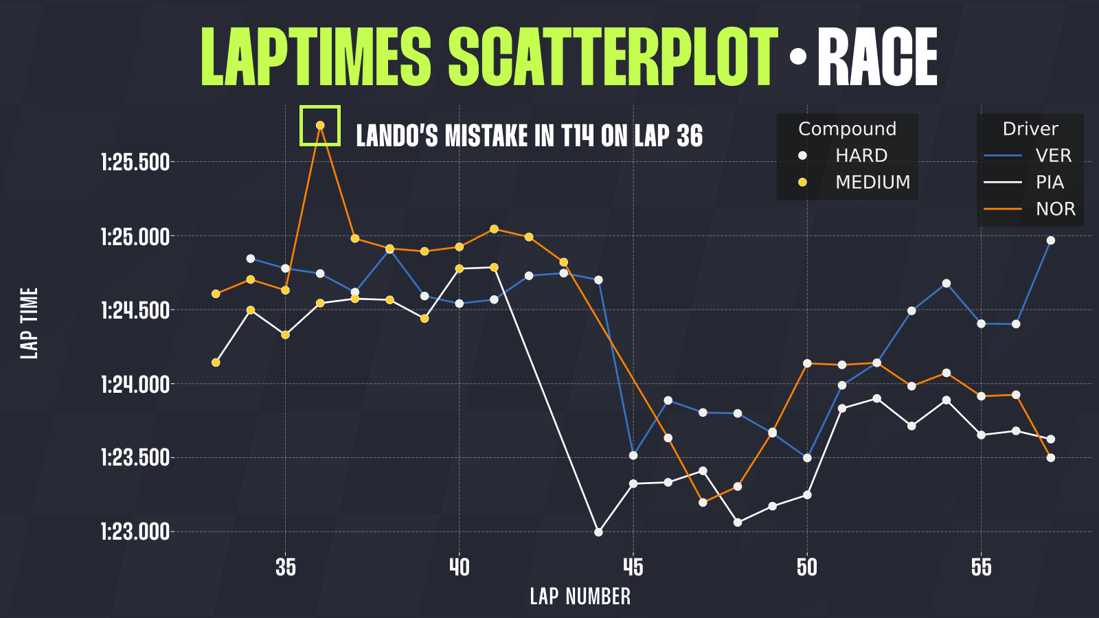 Lando also made a significant mistake at Turn 14 on lap 36, which cost him around a second and later proved even more damaging.