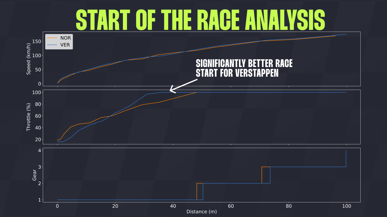 In the first few laps they were around one second per lap quicker, but around lap 18 their pace dropped, and after that it stayed almost identical to Verstappen’s. After the first pit stops, both Piastri and Norris were fortunate to avoid traffic and the relative gap to Max remained the same in the following phase.