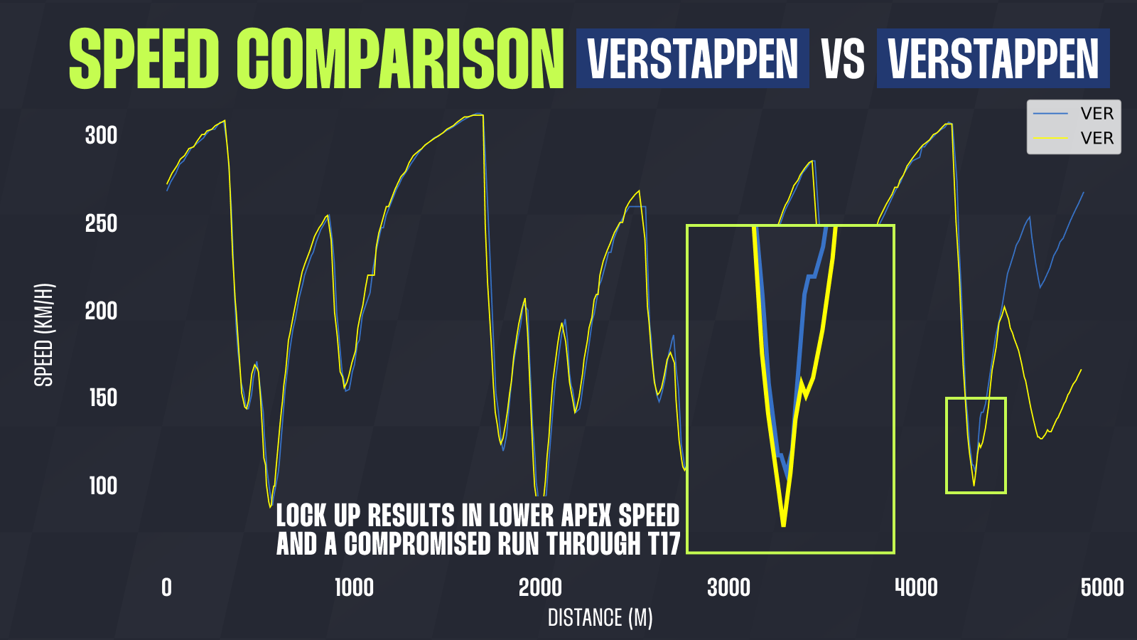 The difference lies in the fact that on his second attempt, Max braked and lifted off the throttle significantly later. After the lock-up, his speed through and out of T17 was notably lower — something clearly visible also during the live broadcast.