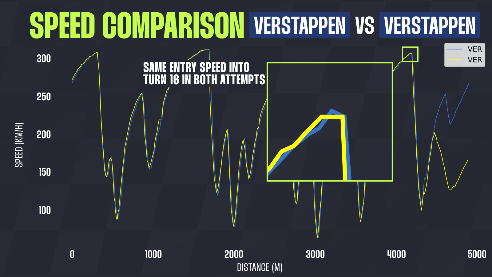 According to the telemetry data, when comparing Max’s first and second flying laps in Q3, his entry speed into T16 was nearly identical.