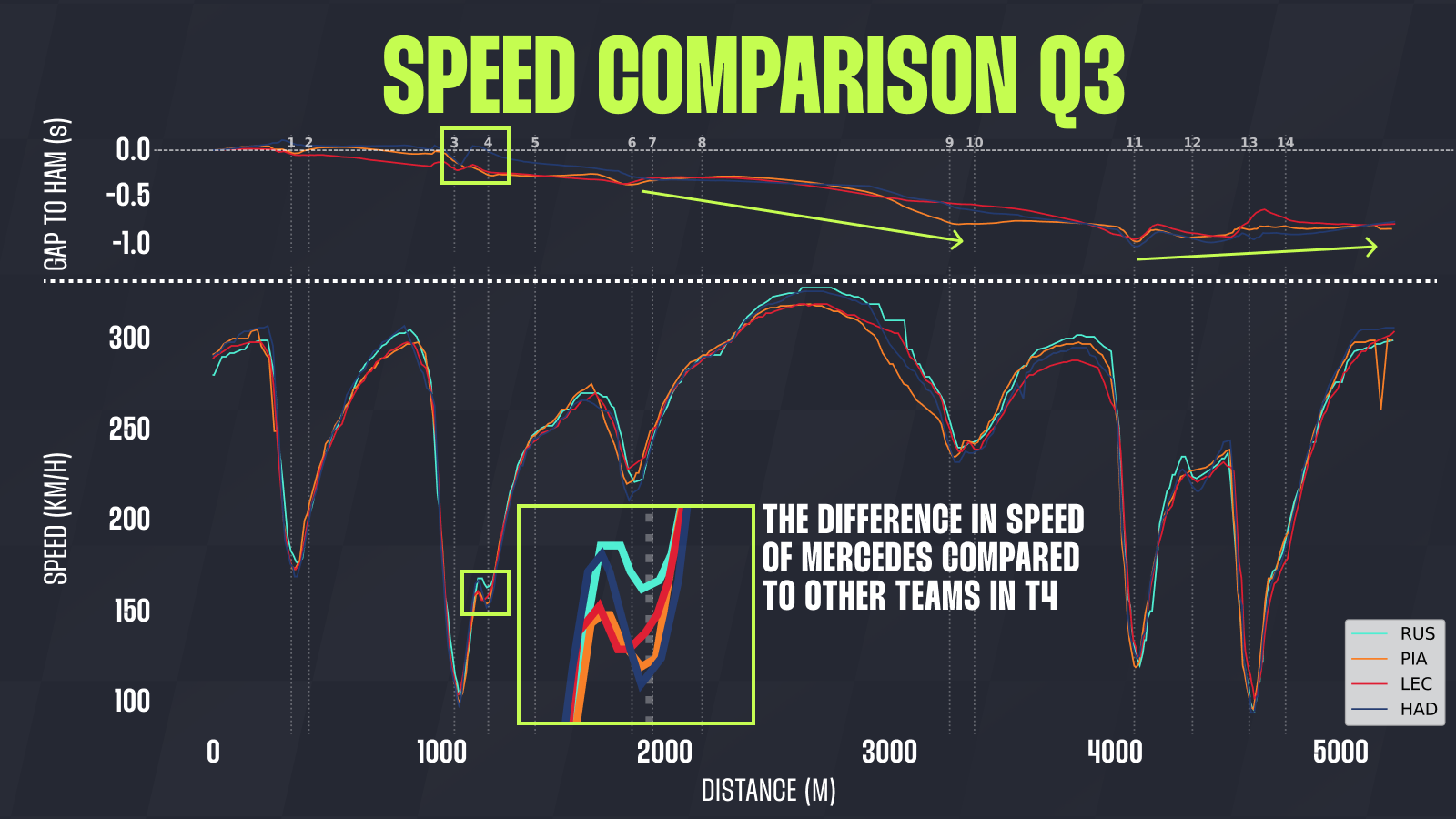 However, as mentioned, T4 is the corner where relatively small time deltas begin to balloon. From the graph above, we can see how much more speed Russell manages to carry through T4. This grants him an immediate advantage of roughly two-tenths over Leclerc and Piastri.