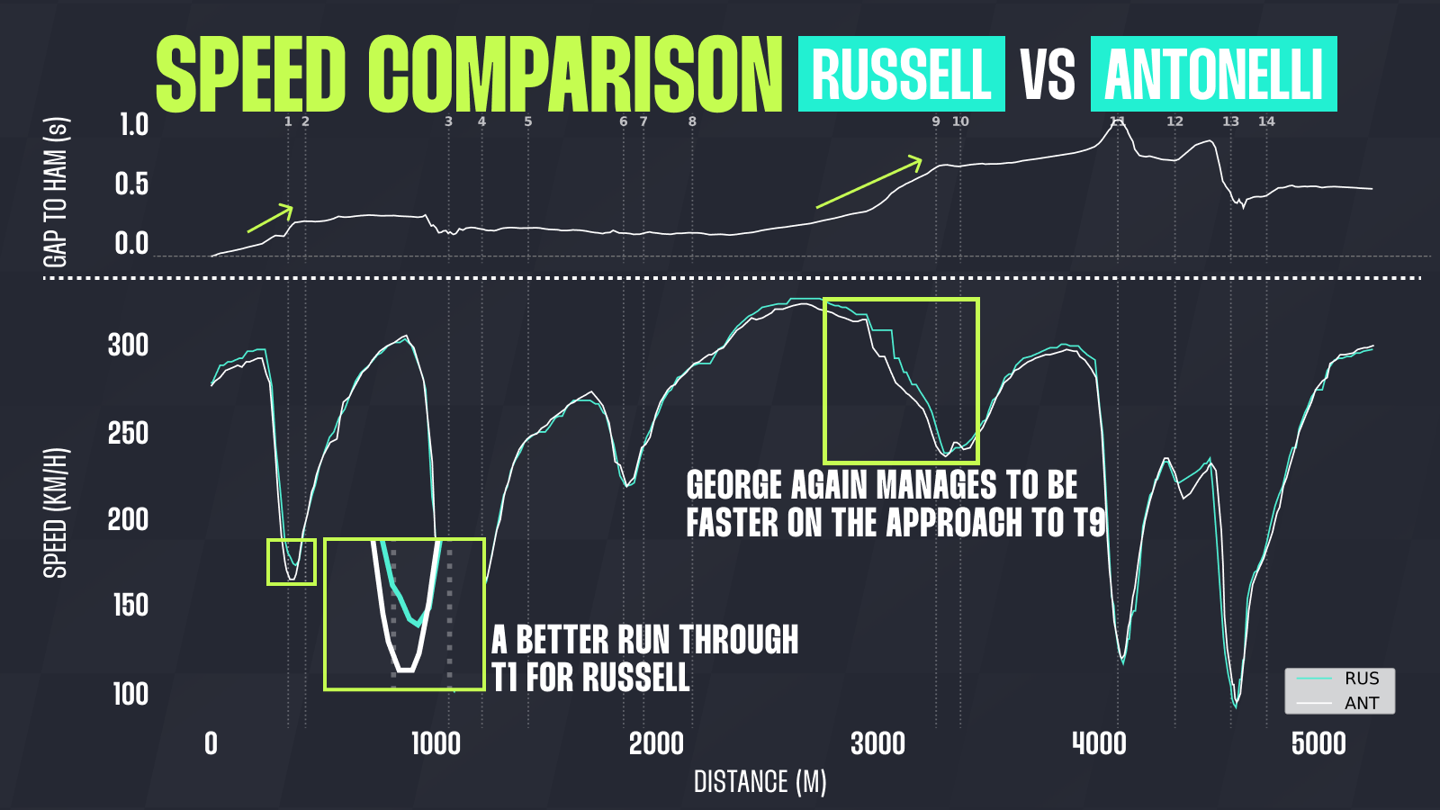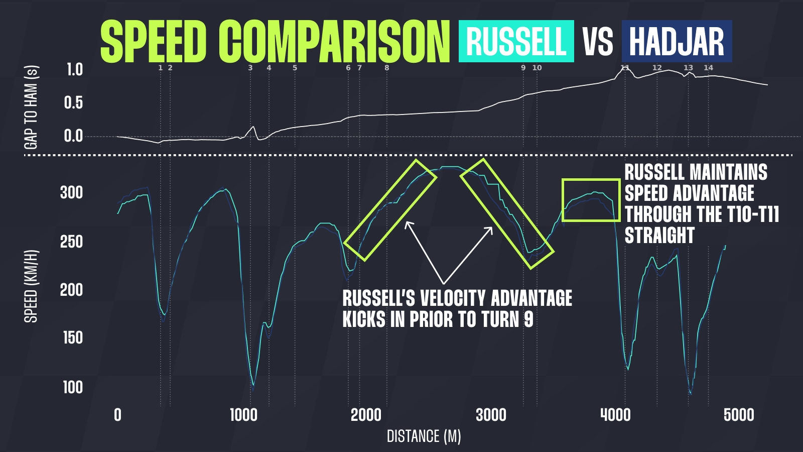 Despite being behind the wheel of identical machinery, Russell managed to extract better entry speed into T9, finding another 0.15 seconds in the process.