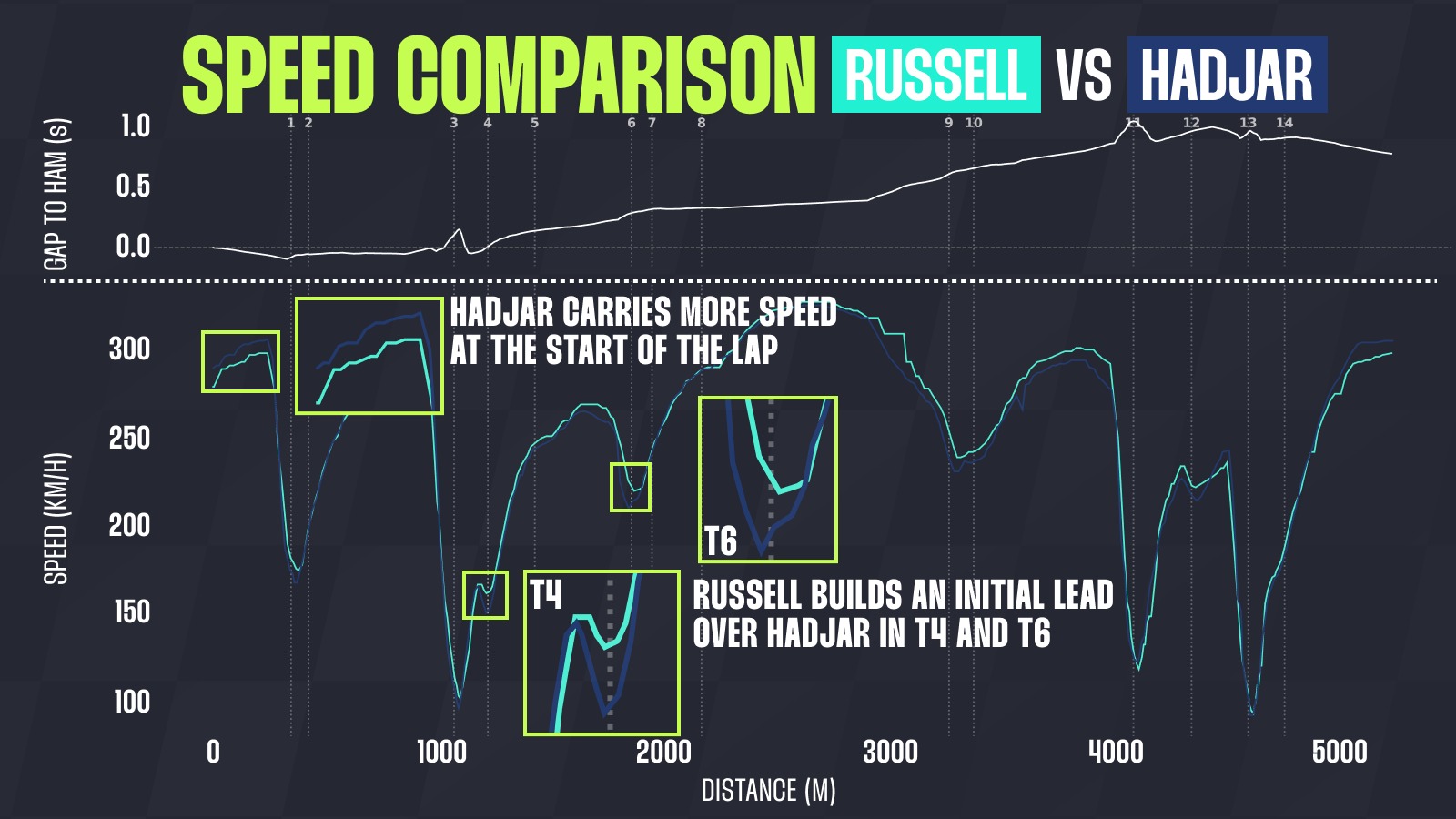However, in the second half of the straight, when the battery drains and the MGU-K switches into energy recovery mode, the delta between Russell and Hadjar begins to open up.