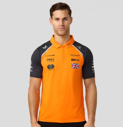 The sponsor logos are some of the most subtle in this year’s lineup and the use of dark blue on the shoulders and sleeves really works on the McLaren polo shirt. The collar itself is papaya and the contrast is a successful one.