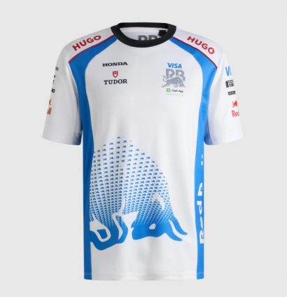 Hugo has knocked it out the park with the new Visa CashApp Racing Bulls polo. Stunningly retro, it features a chaotic mix of giant Red Bull markings down the side, faded Red Bull pattern on the front and blue panelling down the sides of the shirt.