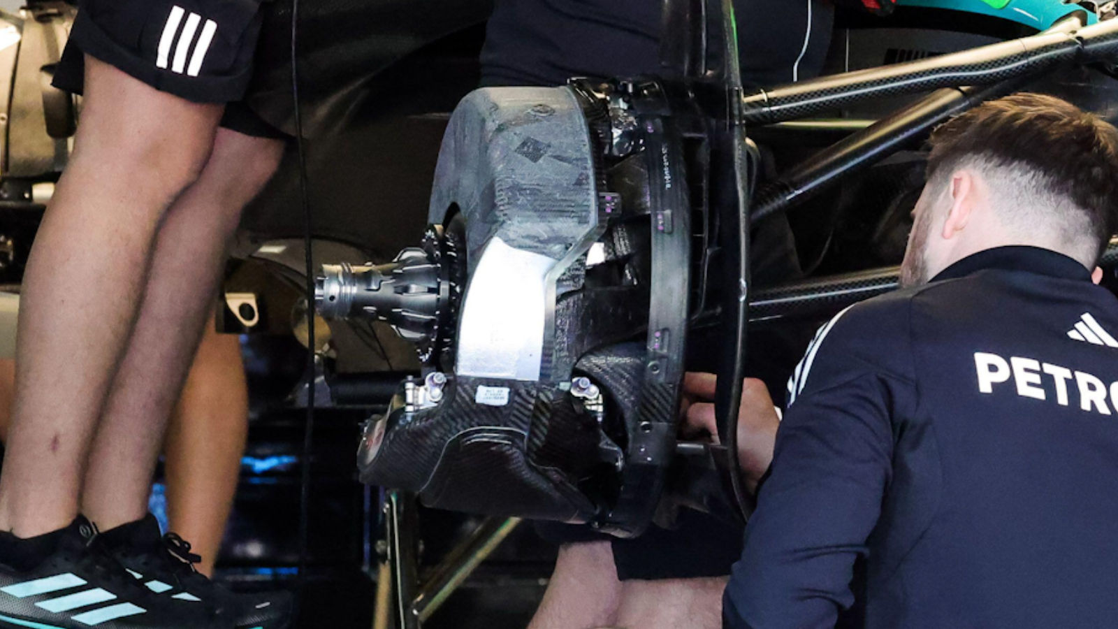 The inner brake disc and caliper fairings on the Mercedes W16.