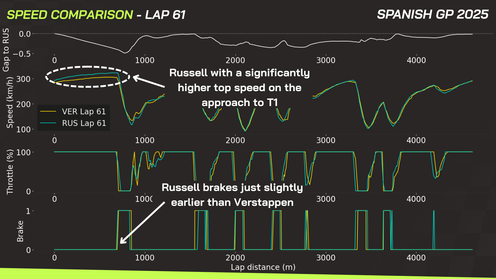 Russell was excellent on the brakes; telemetry data shows he actually braked slightly earlier than Verstappen, and was clearly ahead with his front tyres at the apex of Turn 1, relative to Max’s mirrors.