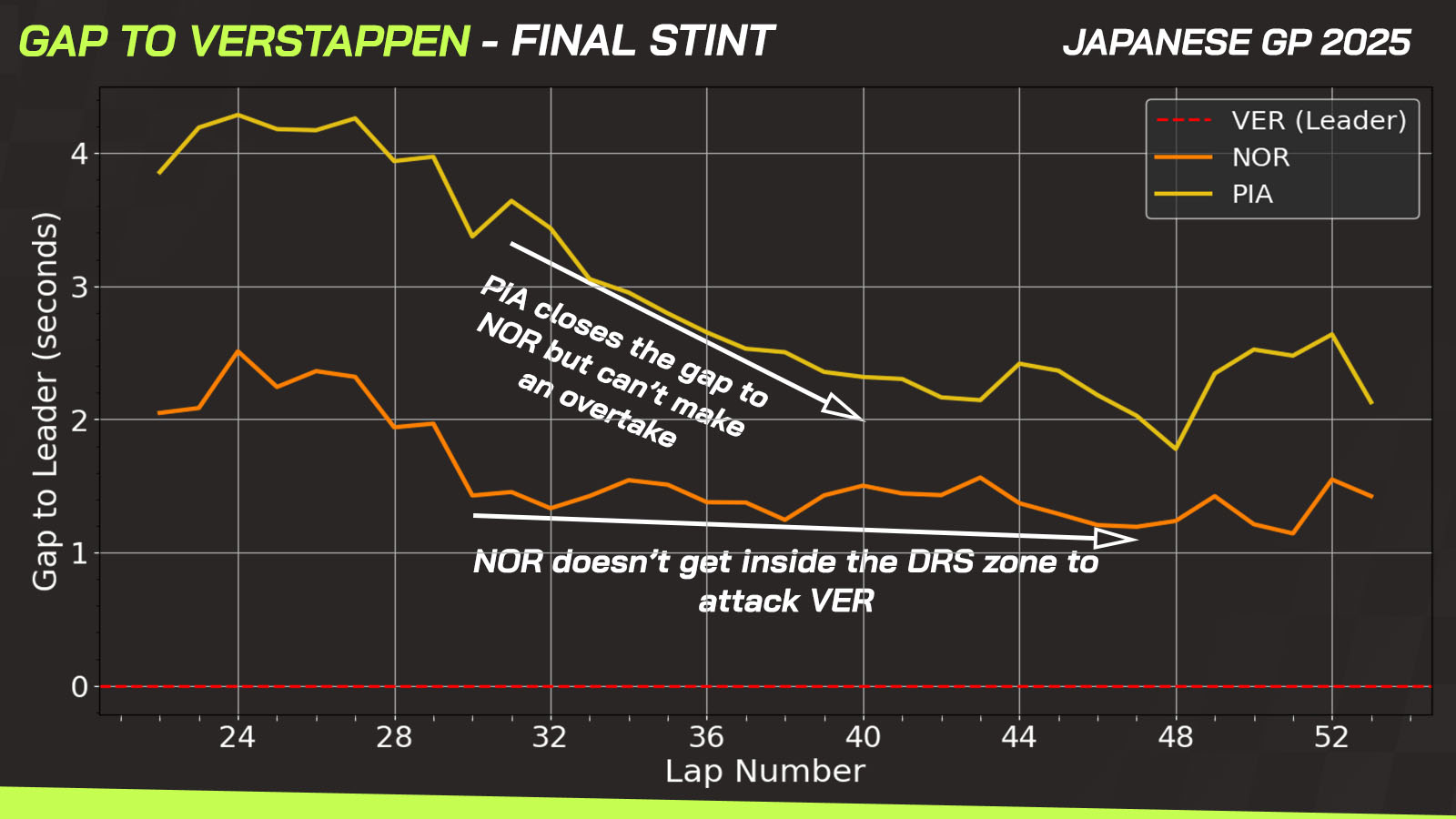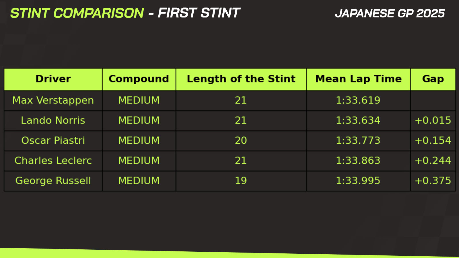 Verstappen was the driver with the best race pace on the medium tyre. Piastri was a little worse in this stint compared to the Dutchman and Lando.