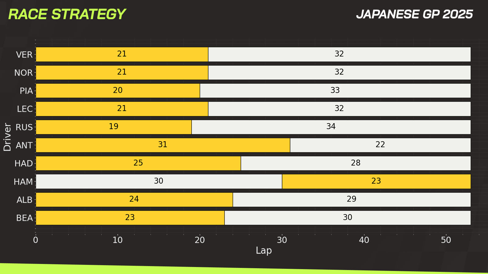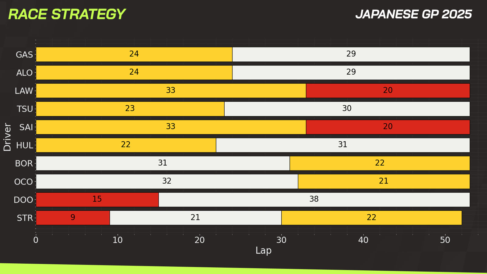After a high-degradation race in 2024, the resurfacing and low track temperatures this season made the Japanese Grand Prix very uneventful, with just one pit stop for the vast majority of drivers.