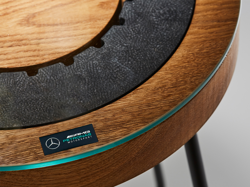 Crafted from a piece of solid oak, the table-top has been shaped to perfectly fit the carbon brake disc. Polished with refined Danish oil and inset with the official Mercedes-AMG Petronas Motorsport plaque, the oak table top is fitted with a toughened glass to protect the original racing heritage.