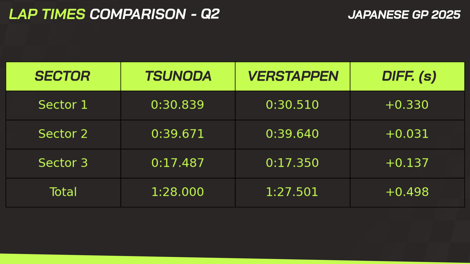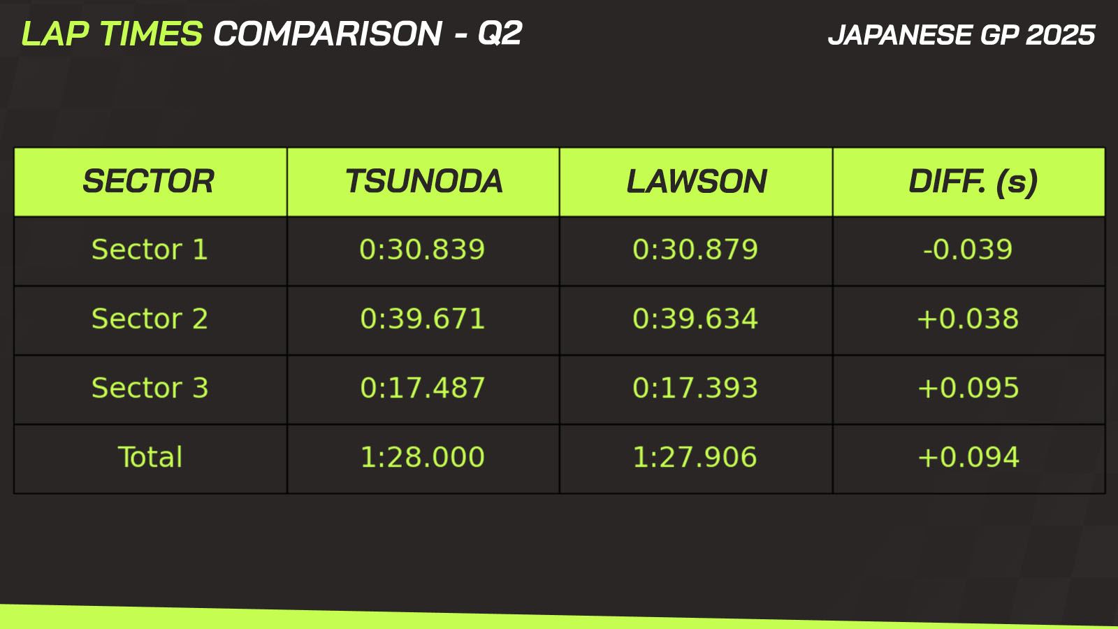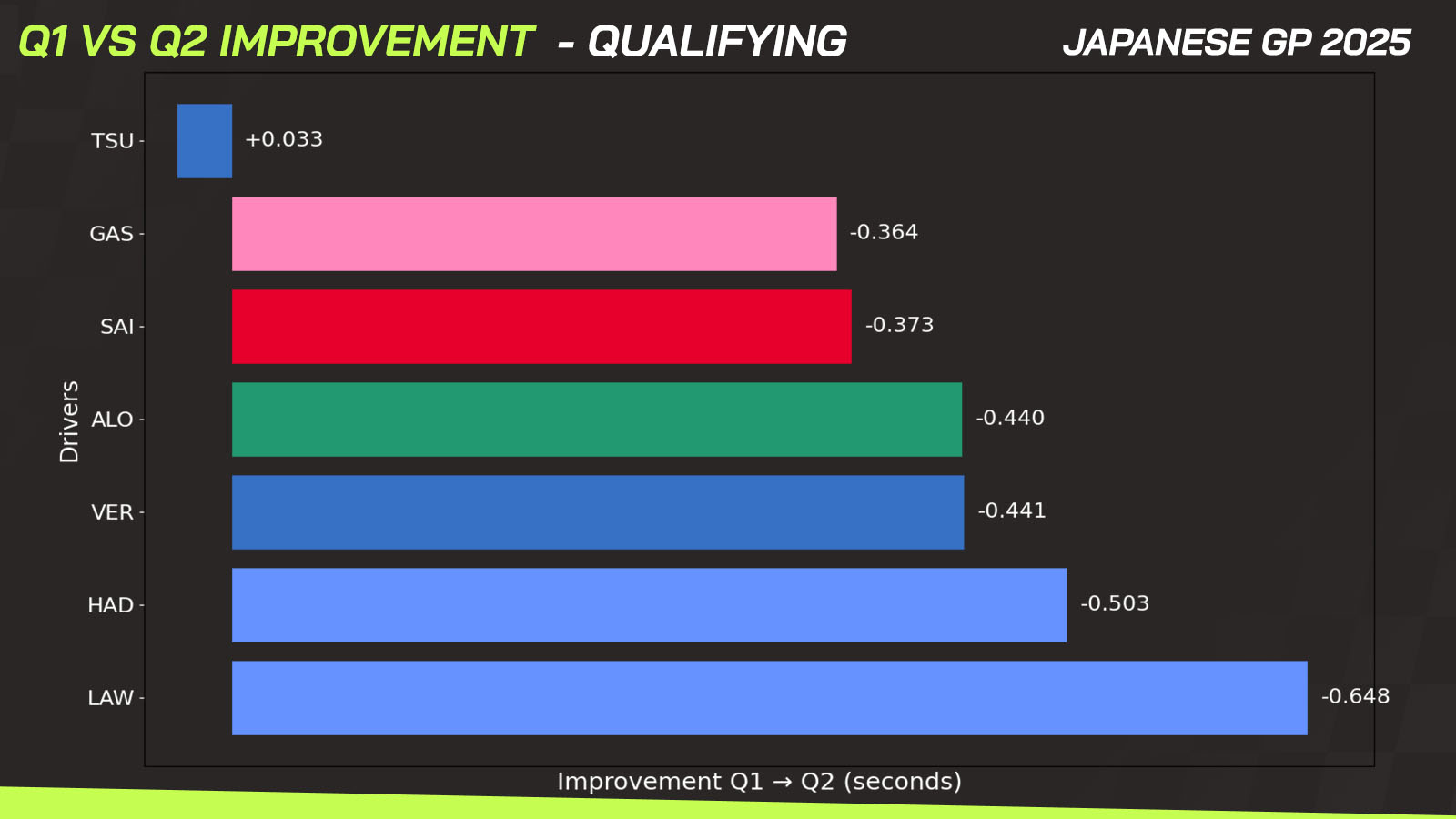 The Japanese driver, racing in front of his home crowd, was unable to put together a strong lap in Q2 and was beaten not only by Verstappen but also by Hadjar and Lawson — both driving the VCARB 02, the clear fifth-best car on the grid at Suzuka.