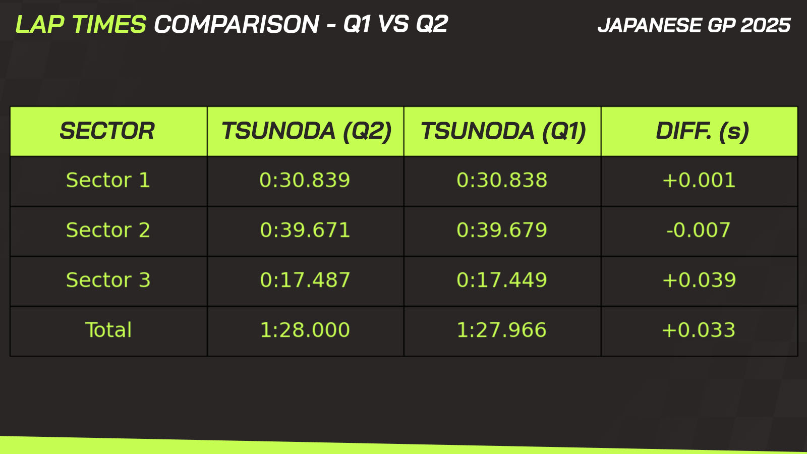 In fact, looking at his sector times, Tsunoda’s Q1 and Q2 laps were nearly identical. However, it was in the third sector where he lost the most time in Q2, particularly through the high-speed left-hander 130R at Suzuka.