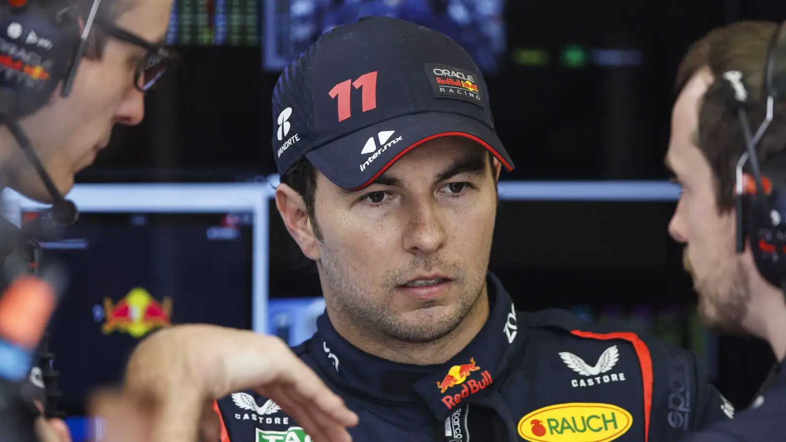 Sergio Perez in the Red Bull garage being spoken to by engineers. Bahrain, February 2023.