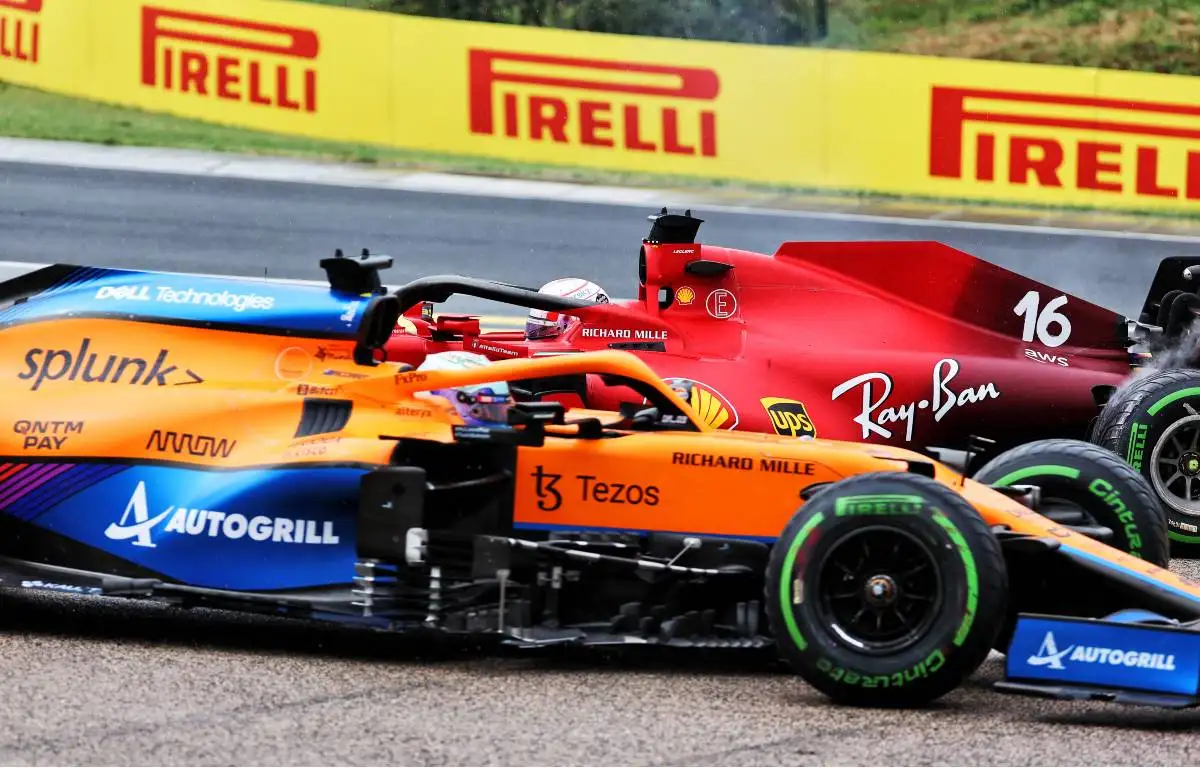 Lando Norris. McLaren, Charles Leclerc, Ferrari, after 2021 Hungarian Grand Prix melee