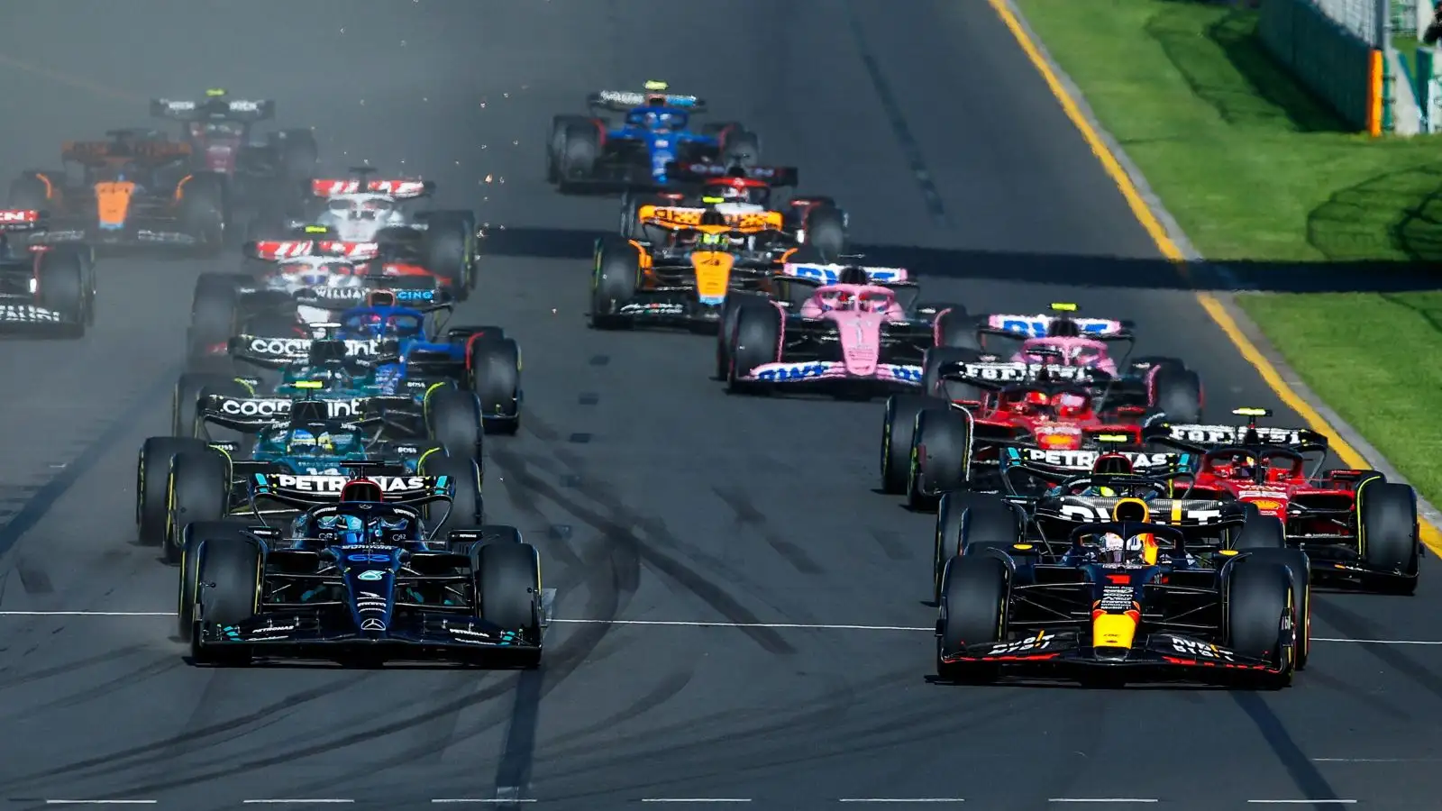 The cars move off the starting grid. Melbourne, Australia. April 2023.