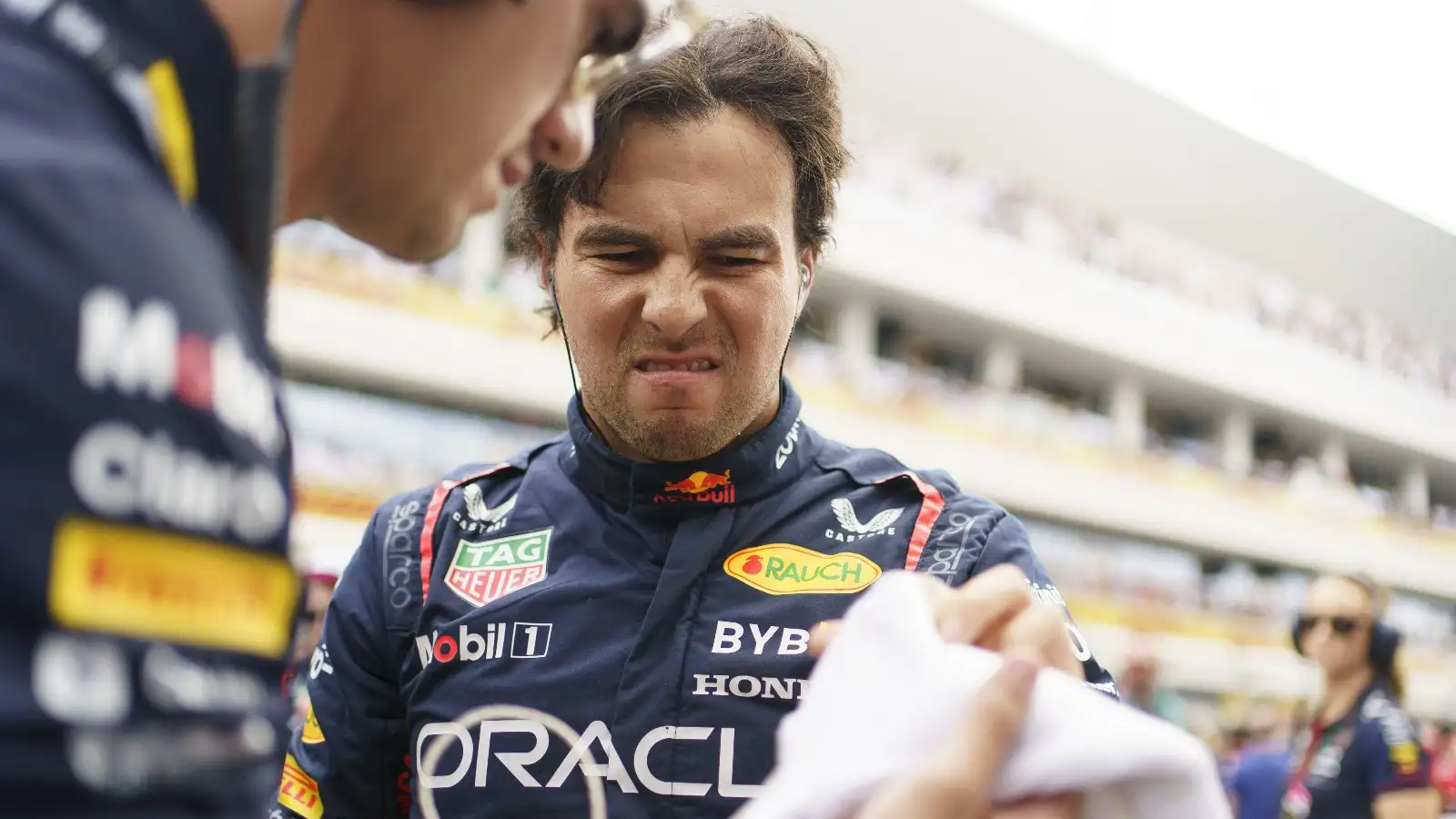Red Bull driver Sergio Perez pulls a disapproving face.