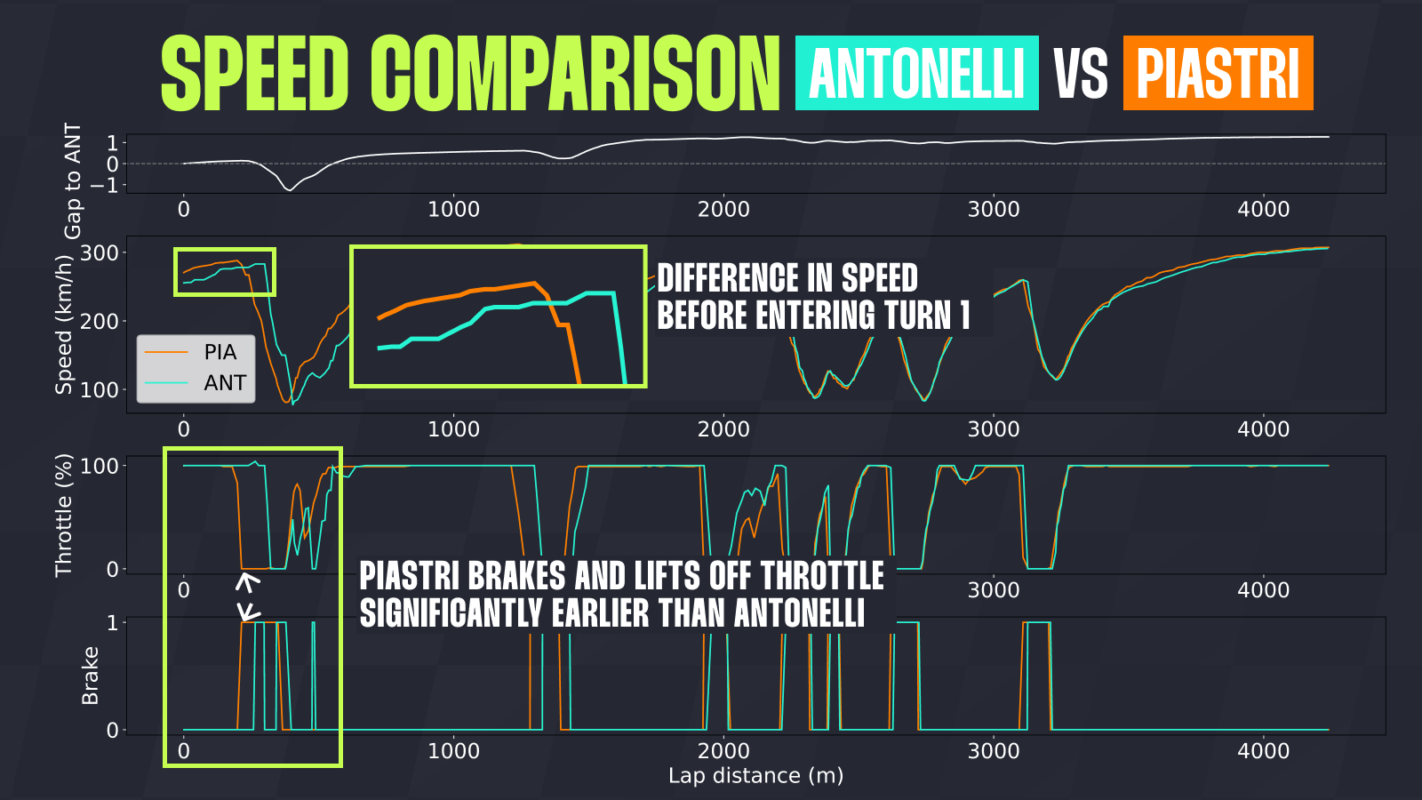 Telemetry shows just how much higher Piastri’s entry speed was into Turn 1, and how much earlier he was forced to brake compared to Antonelli.