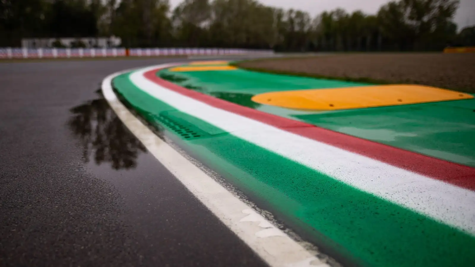 A puddle sits on one of the kerbs at the Imola circuit ahead of the 2022 Emilia Romagna Grand Prix. Imola, April 2022.