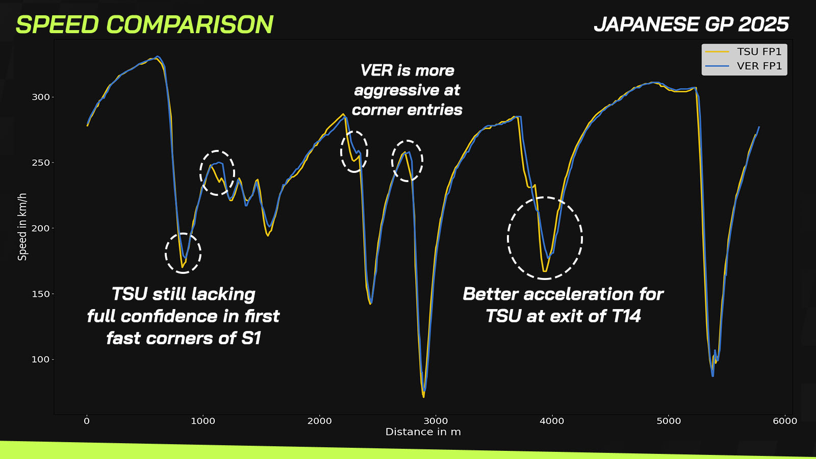 Despite lacking Verstappen’s confidence and aggressive turn-in style, the Japanese driver appears to have found a balance that allows for better exit acceleration – particularly through the tricky Turn 14 before the back straight leading to 130R.
