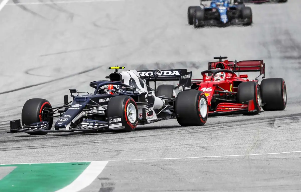 The pair came out of Turn 1 and Leclerc moved to tuck in behind the AlphaTauri, but clipped his front wing off Gasly’s left-rear tyre in doing so, which caused a puncture that ultimately ended the Frenchman’s race.