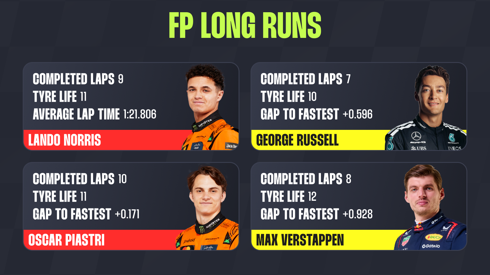 His name is also at the top when we look at long-run simulations from FP2. The grip was lower than what will be expected during the main race, and we can’t be sure about engine modes or fuel levels, but the data can still point us in the right direction.