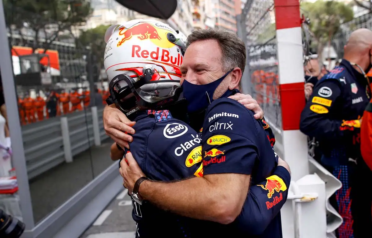 Max Verstappen and Christian Horner celebrate victory at the 2021 Monaco Grand Prix