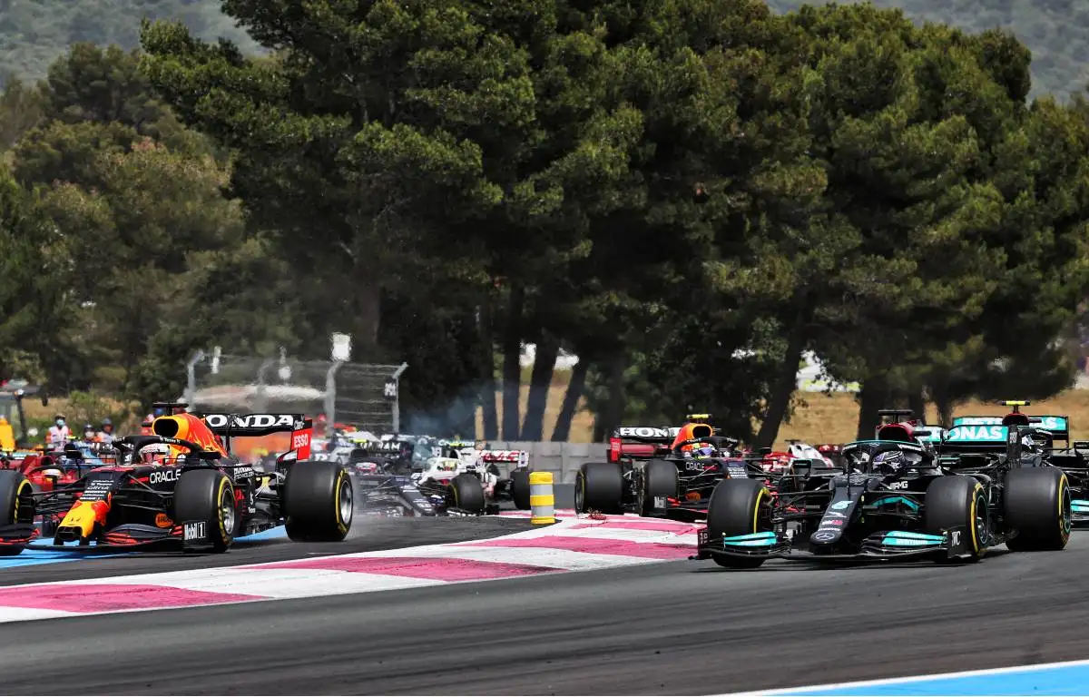 Max Verstappen's Red Bull runs wide out of Turn 1 at the 2021 French Grand Prix