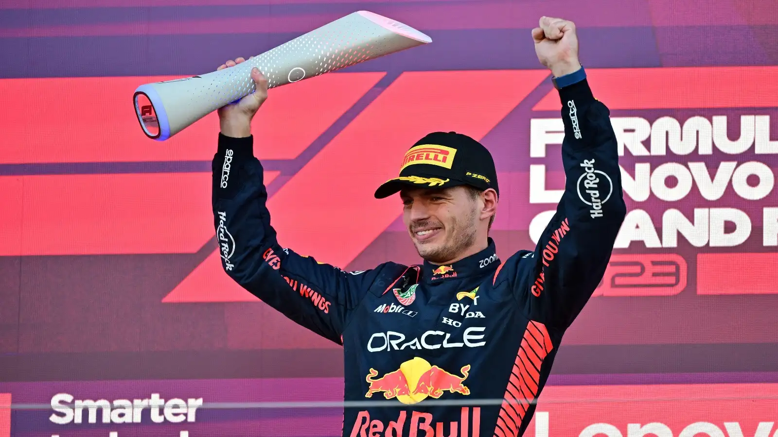 Max Verstappen lifts the trophy aloft after winning the 2023 Japanese Grand Prix at Suzuka.