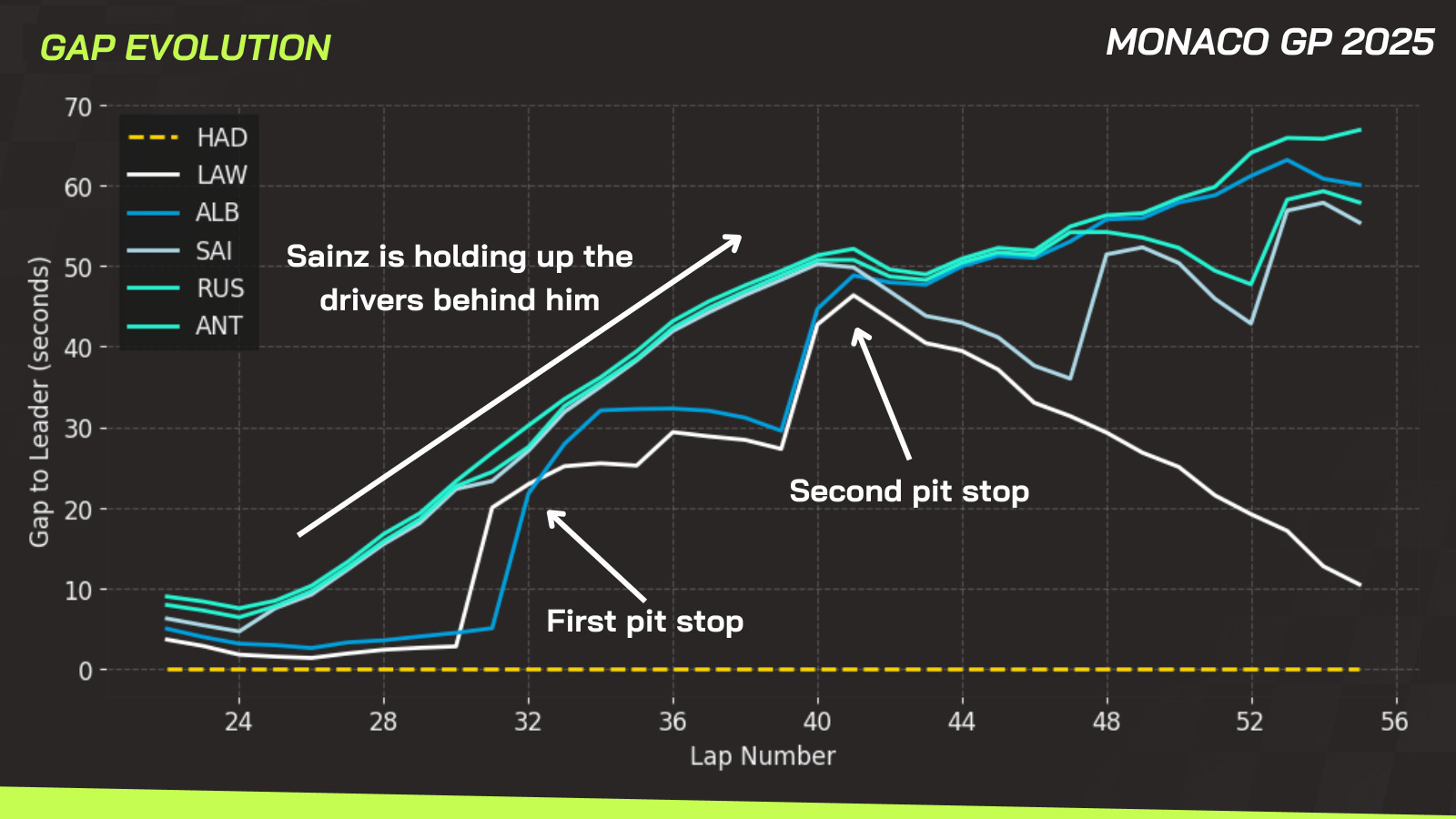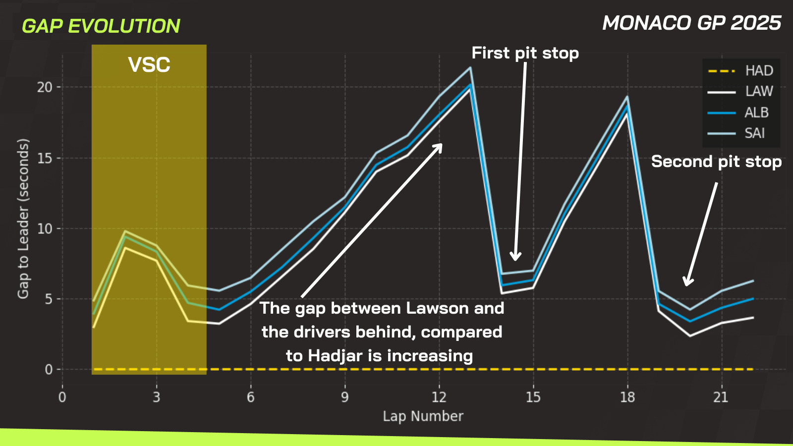 In his second stint, Hadjar was consistently 4 to 5 seconds faster per lap than Lawson and the pack behind him. In fact, Lawson was intentionally even slower in this phase.