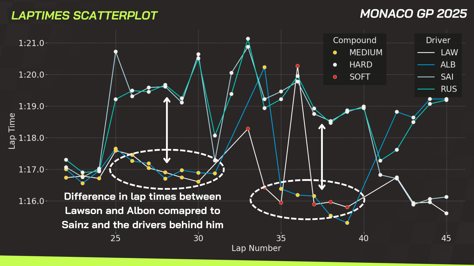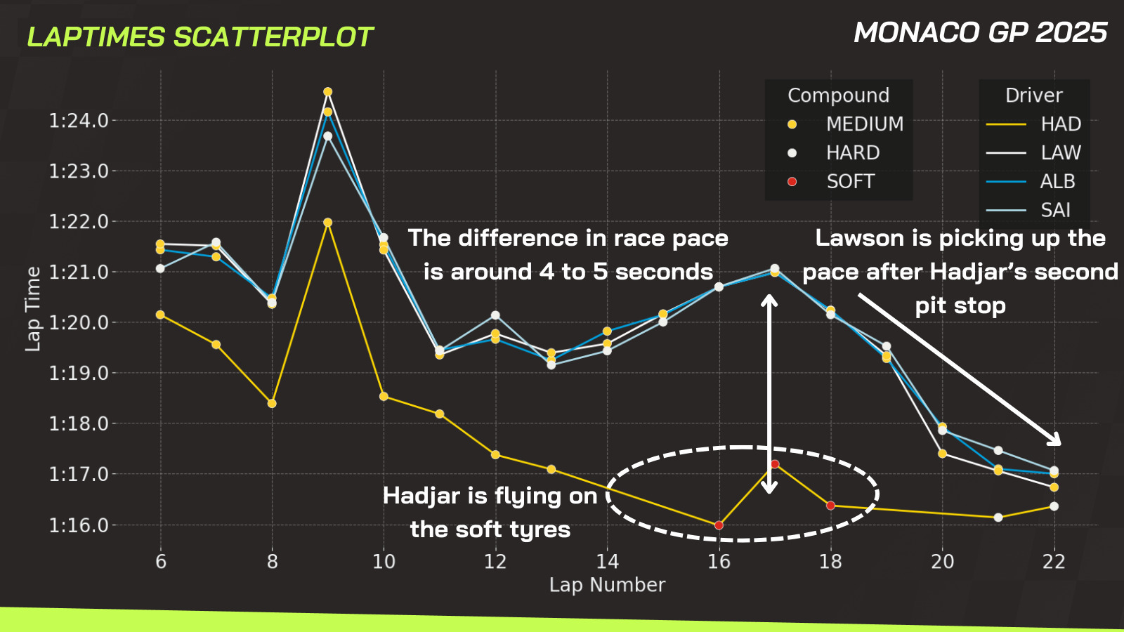 Hadjar only stayed on the softs for five laps – just enough to build the gap. Once he completed his second stop, Lawson picked up the pace dramatically, as shown in the lap time chart.