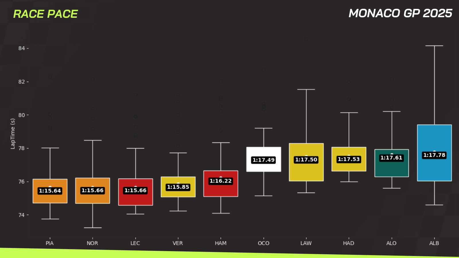 And Monaco as a circuit absolutely allows for this kind of strategy; if you want to overtake someone here, the data shows that you need to be at least four seconds per lap faster than the car in front to have a realistic chance.