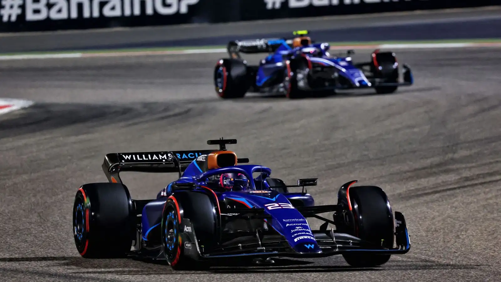 Alex Albon ahead of his Williams team-mate Logan Sargeant. Bahrain, March 2023.