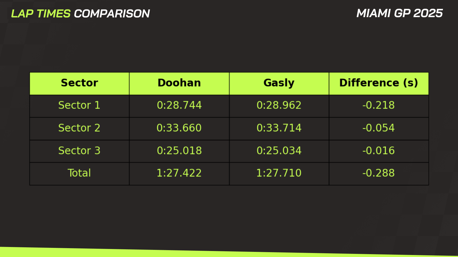 His teammate Jack Doohan made it to Q2, and a comparison of their Q1 lap times shows that Gasly lost most of his time in Sector 1, while both were fairly even across the rest of the track.