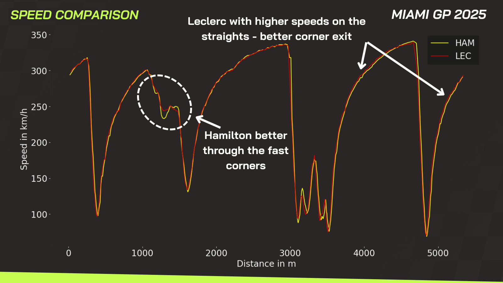 A slightly weaker exit through T16 allowed Leclerc to close the gap in the DRS zone. After that, Hamilton made an error in T17, compromising his line through the final two corners and losing time.