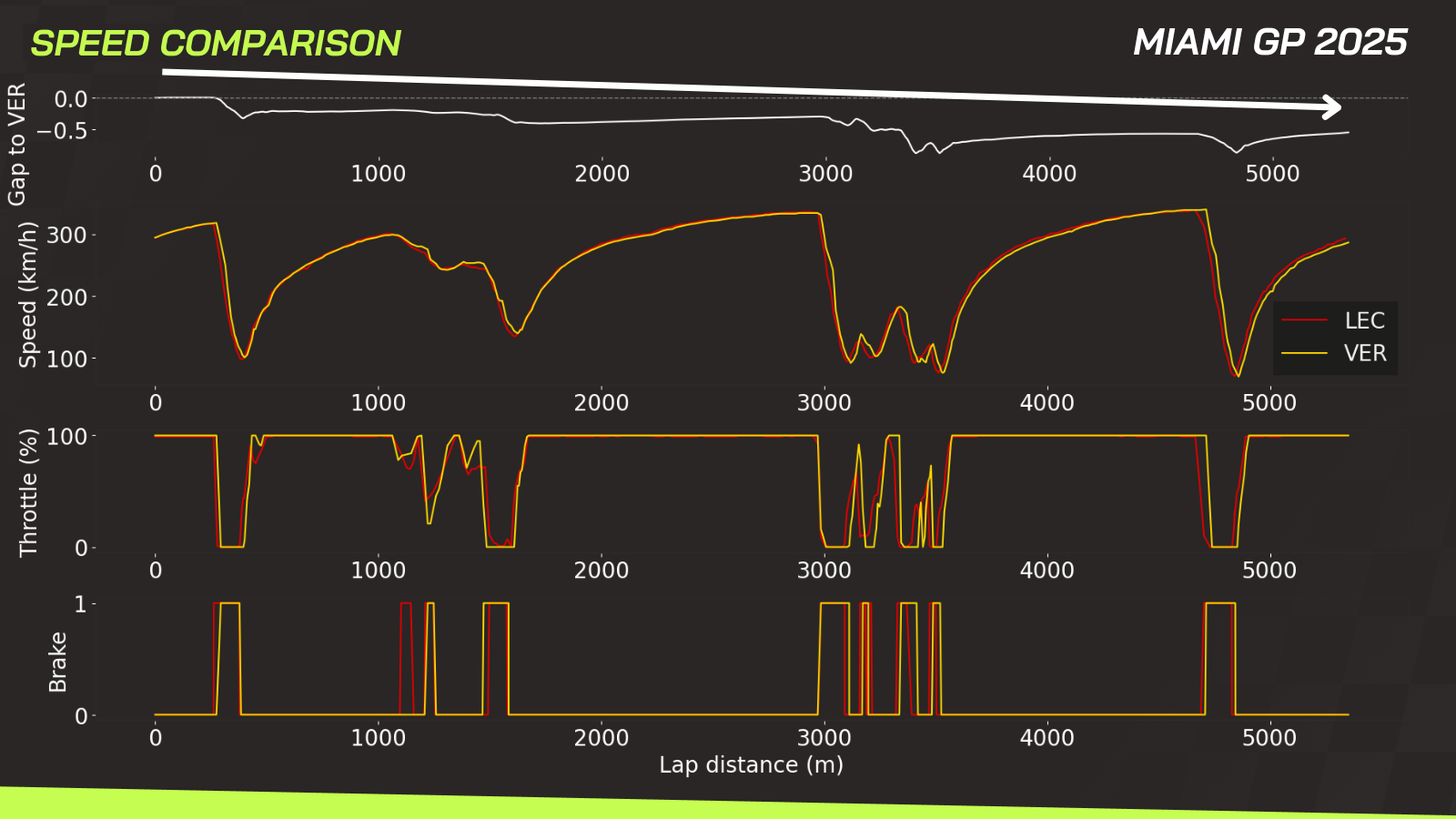 A comparison of Verstappen and Leclerc’s fastest laps shows that the Ferrari driver is losing time all around the circuit. The SF-25 is highly sensitive to setup, and right now it seems almost impossible to extract strong results from it. We’ll see whether Ferrari can recover with a bold race strategy.