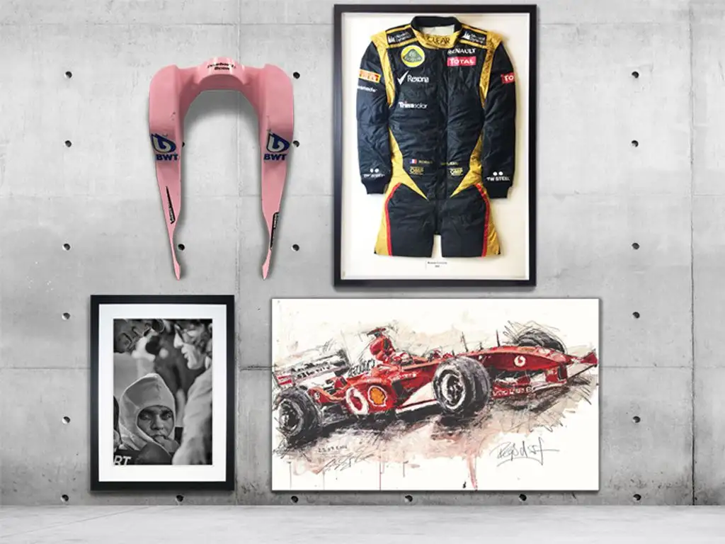 Browse the latest race-used car parts for mounting to your wall, such as Sergio Perez’ race-used headrest, race-worn teamwear such as Romain Grosjean’s Lotus F1 race suits, PLUS original artworks by Armin Flossdorf, Paul Oz and more.